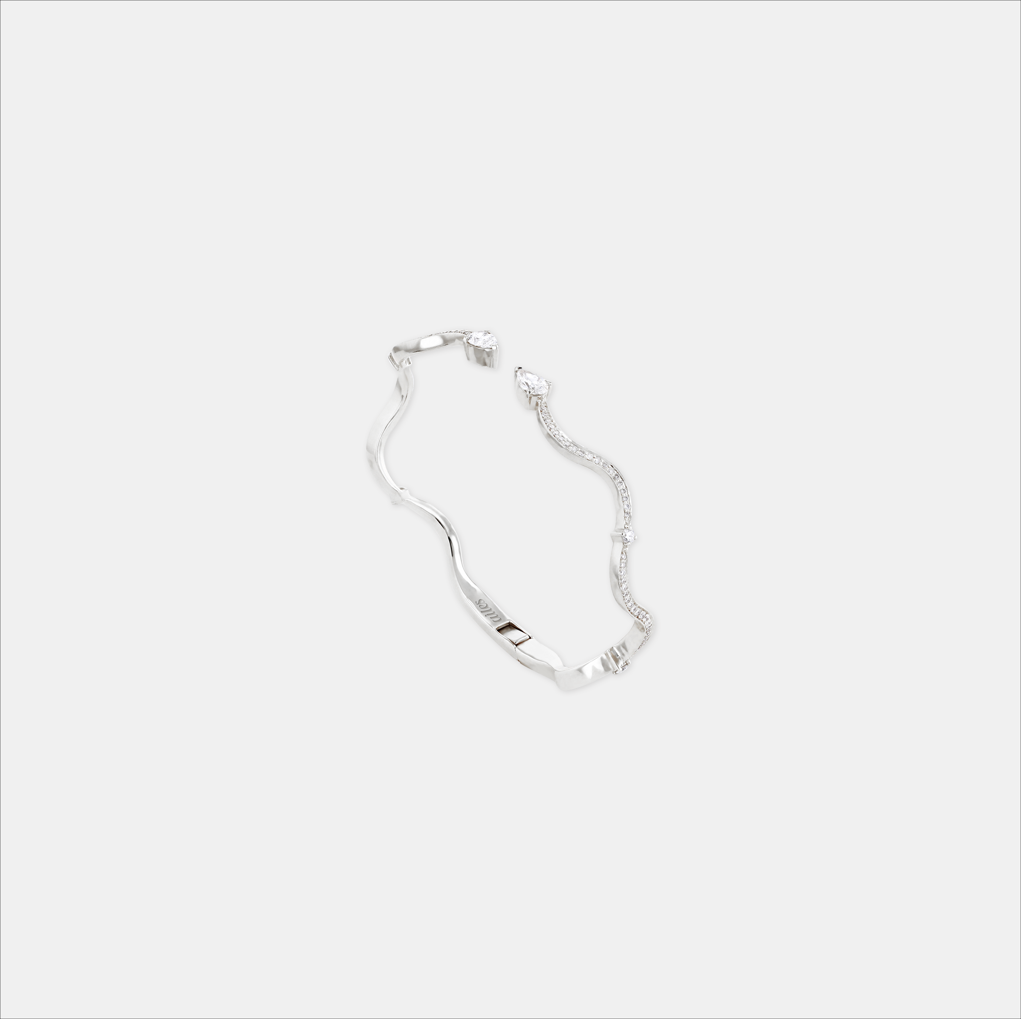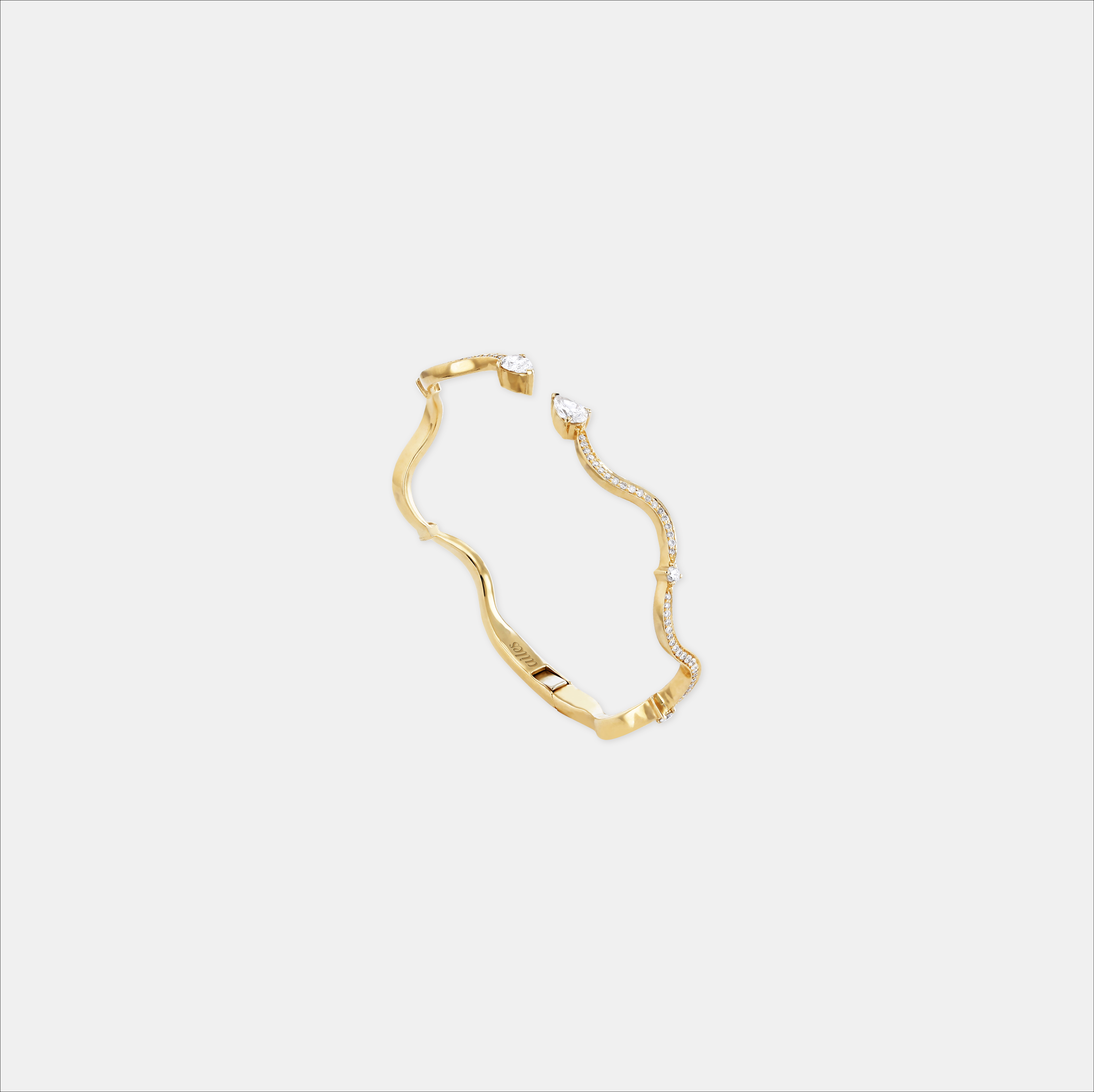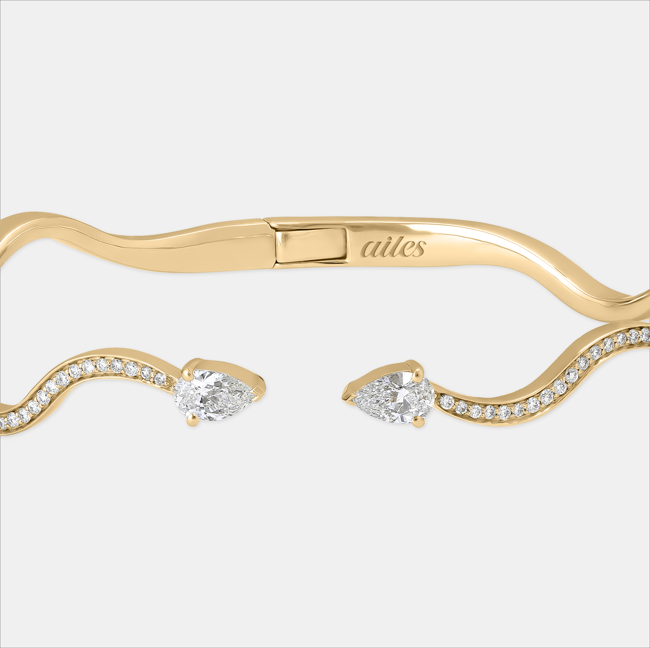An emblem of movement and grace, this sculptural bangle flows in fluid wave-like lines of polished yellow gold. At each open end, a pear-cut diamond meets a sweep of pavé-set VS stones, creating a play of brilliance that is both refined and strikingly modern.