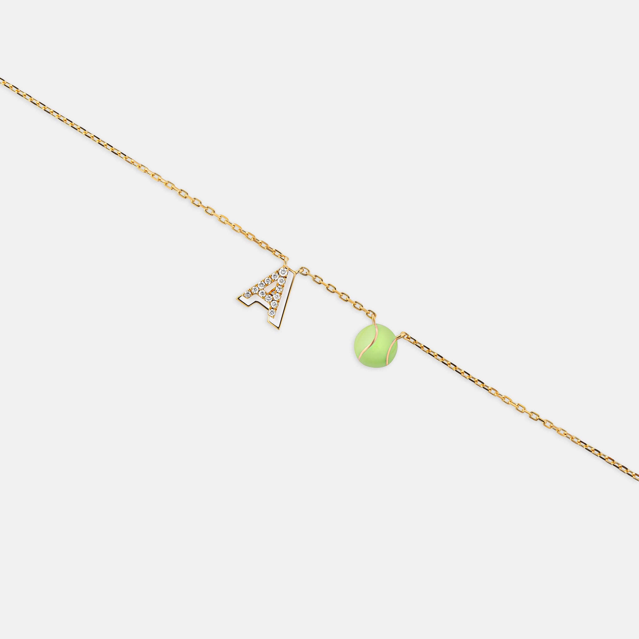 This letter anklet, crafted in 18K gold, drapes lightly around the ankle, adorned with a delicate ball charm and sparkling round brilliant diamond. The smooth enamel detail adds a quiet, refined accent — a graceful expression of personal style in motion.