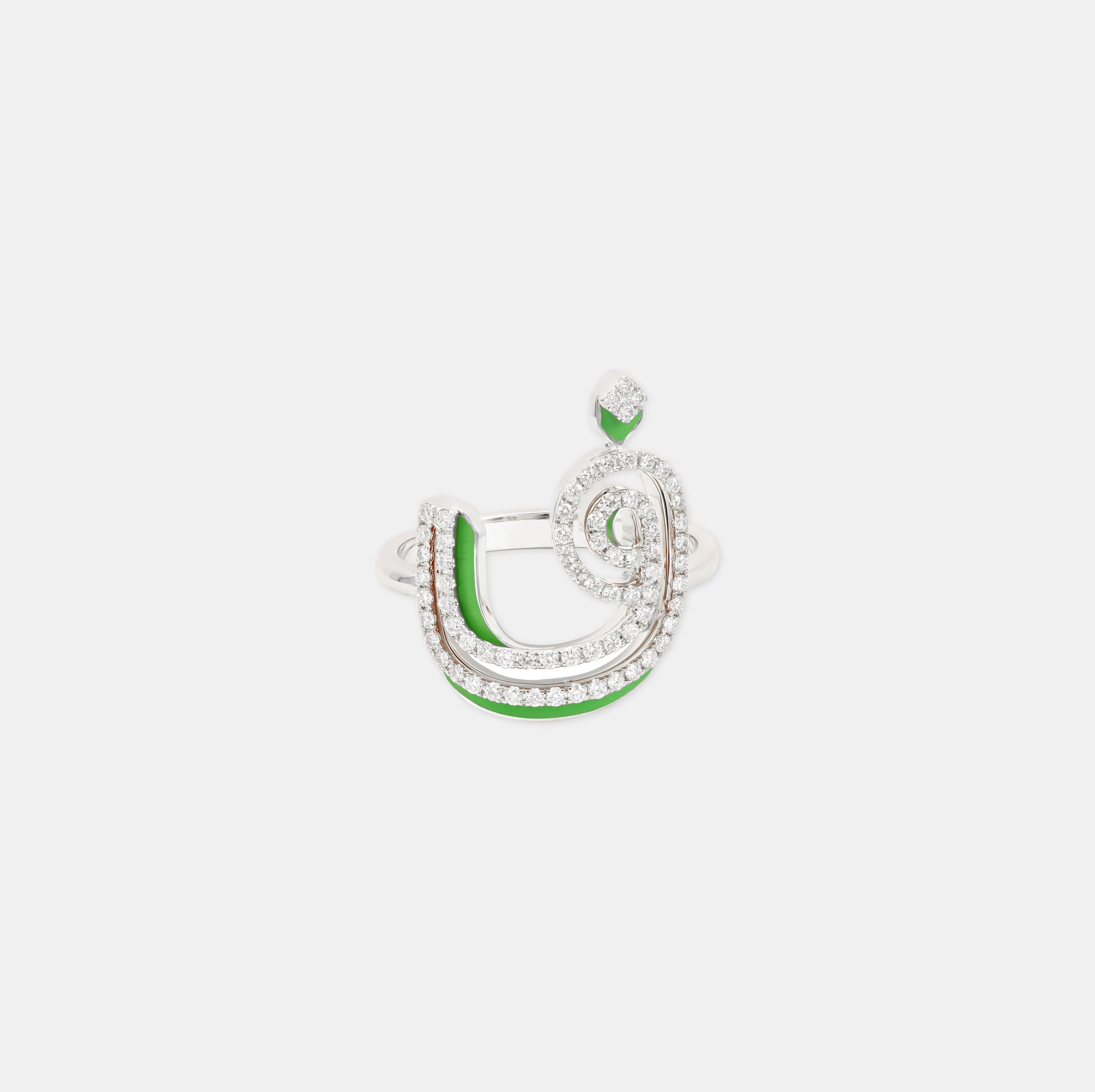 A playful nod to personalization, the Silhouette Ring features a letter motif framed by 0.35 carats of VS diamonds. Crafted in 18K yellow or white gold with a delicate enamel-traced center, it combines refined elegance with a youthful, individual spirit.
