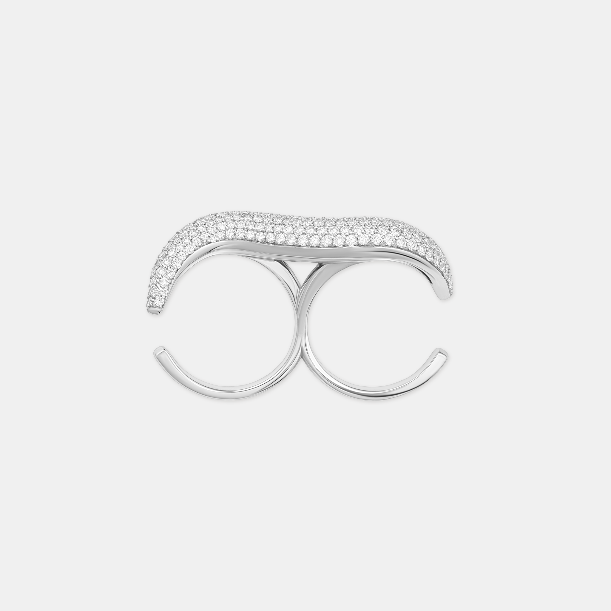 Ailes’ signature wave form is reimagined in this striking two-finger design, capturing movement and fluidity in a sweep of light. Hand-set with VS diamonds over a sculptural 18K yellow or white gold base, it is a bold statement of artistry and precision.