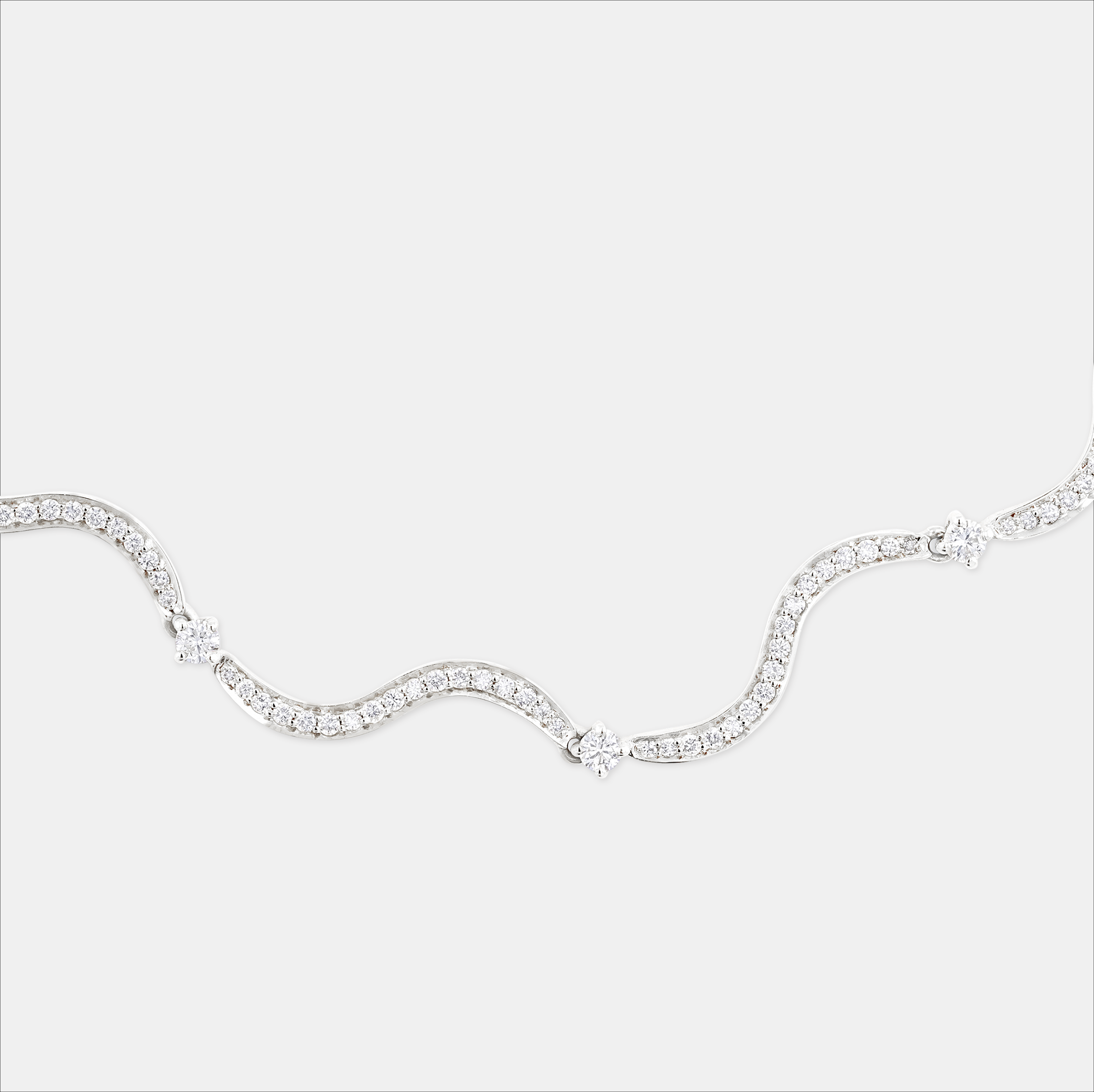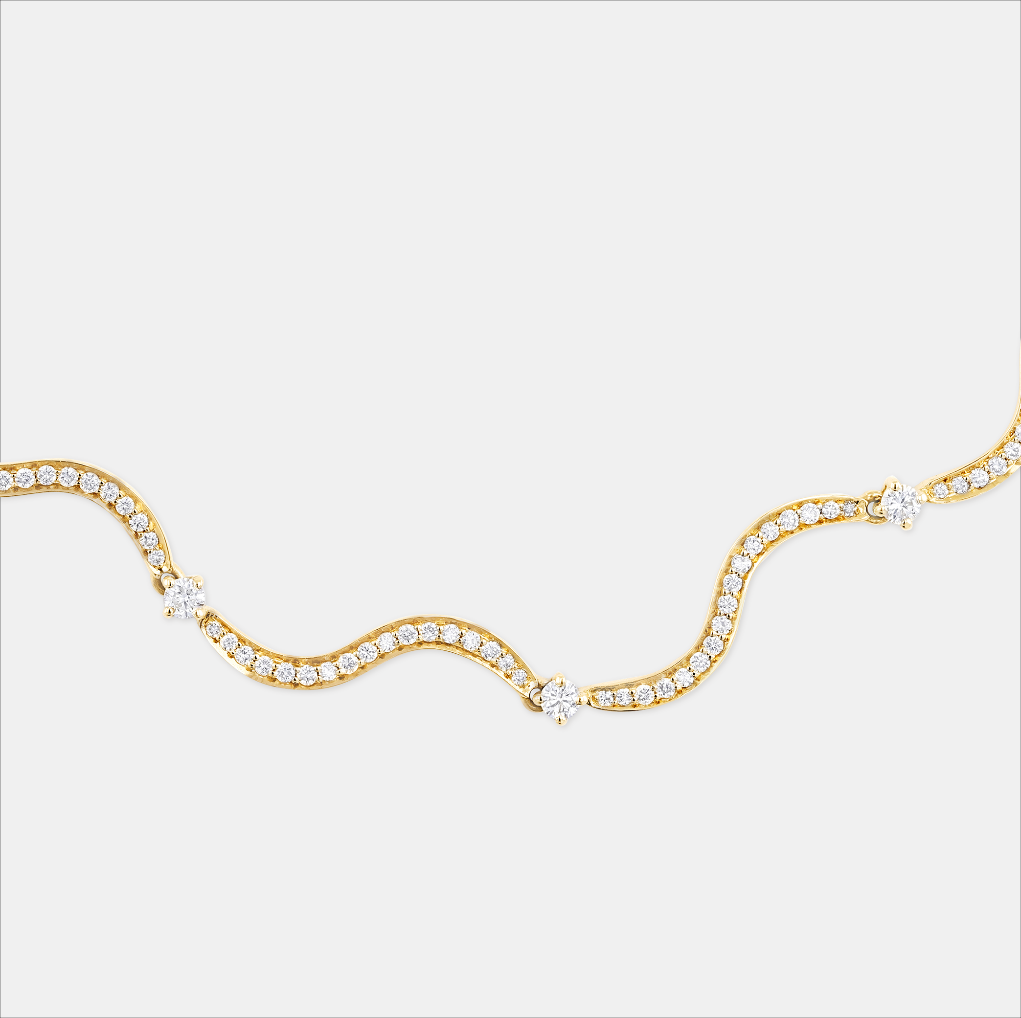 The Wave Necklace captures the fluidity of motion in a refined silhouette, draping the neckline with a seamless flow of brilliance. Crafted in 18K yellow or white gold and fully set with VS diamonds, it radiates timeless elegance and versatility.