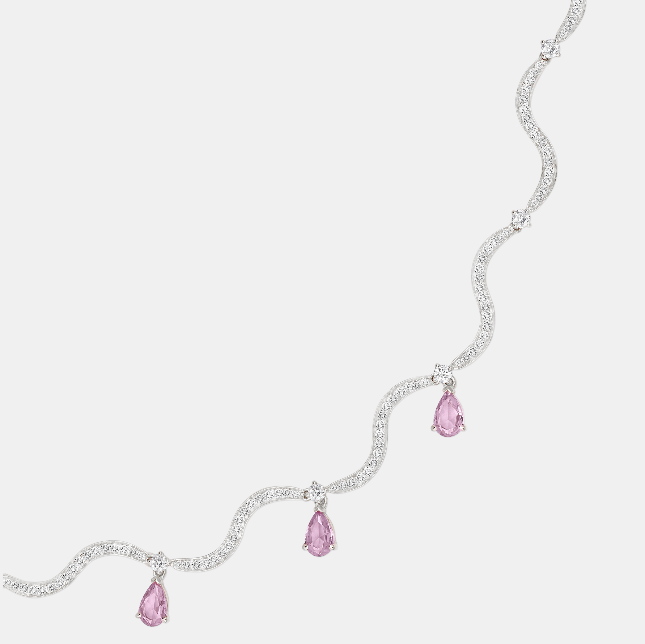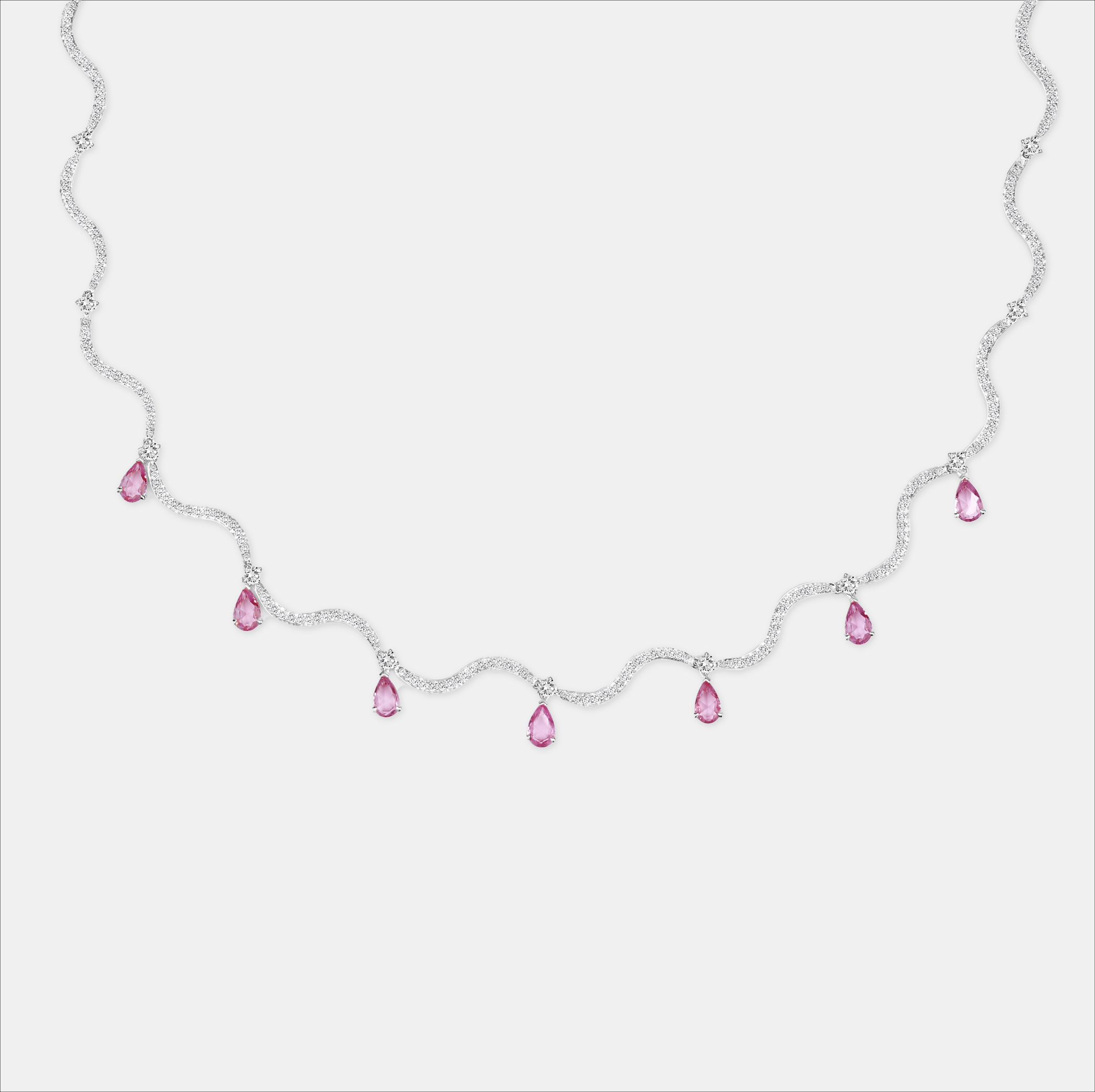 A luminous celebration of movement and color, this necklace sculpts the neck in 18K yellow or white gold with a flowing wave motif. Set with 1.57 carats of VS diamonds along the entire necklace and finished with 2.29 carats of pear-cut pink sapphires that dangle gracefully, it captures light and motion in every angle.